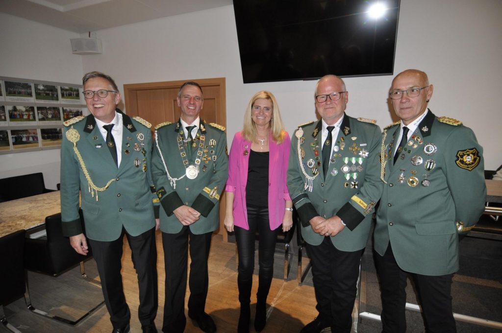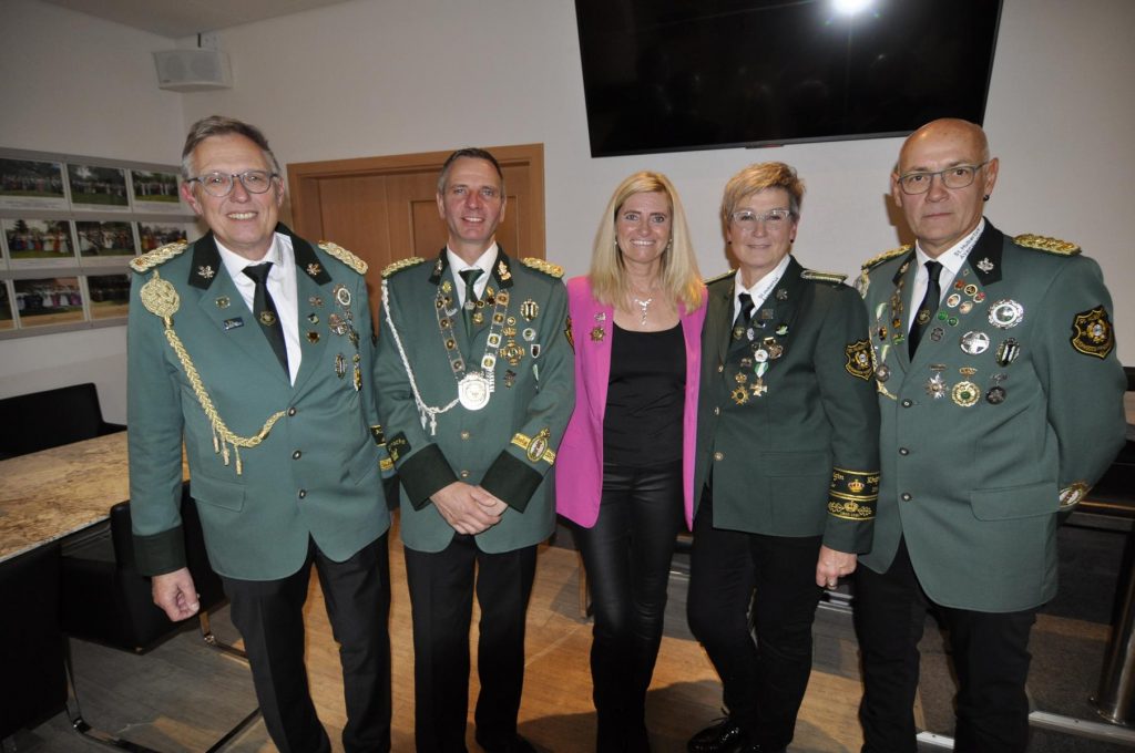eingerahmt vom 1. Brudermeister Rainer Peters, Stelv. Brudermeister Jürgen Dreisilker und dem Königspaar Ralf Kempkensteffen u. Swetlana Eickmann