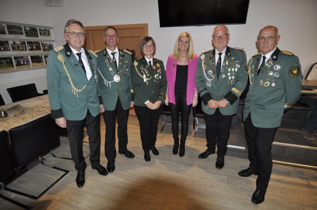 eingerahmt vom 1. Brudermeister Rainer Peters, Stelv. Brudermeister Jürgen Dreisilker und dem Königspaar Ralf Kempkensteffen u. Swetlana Eickmann